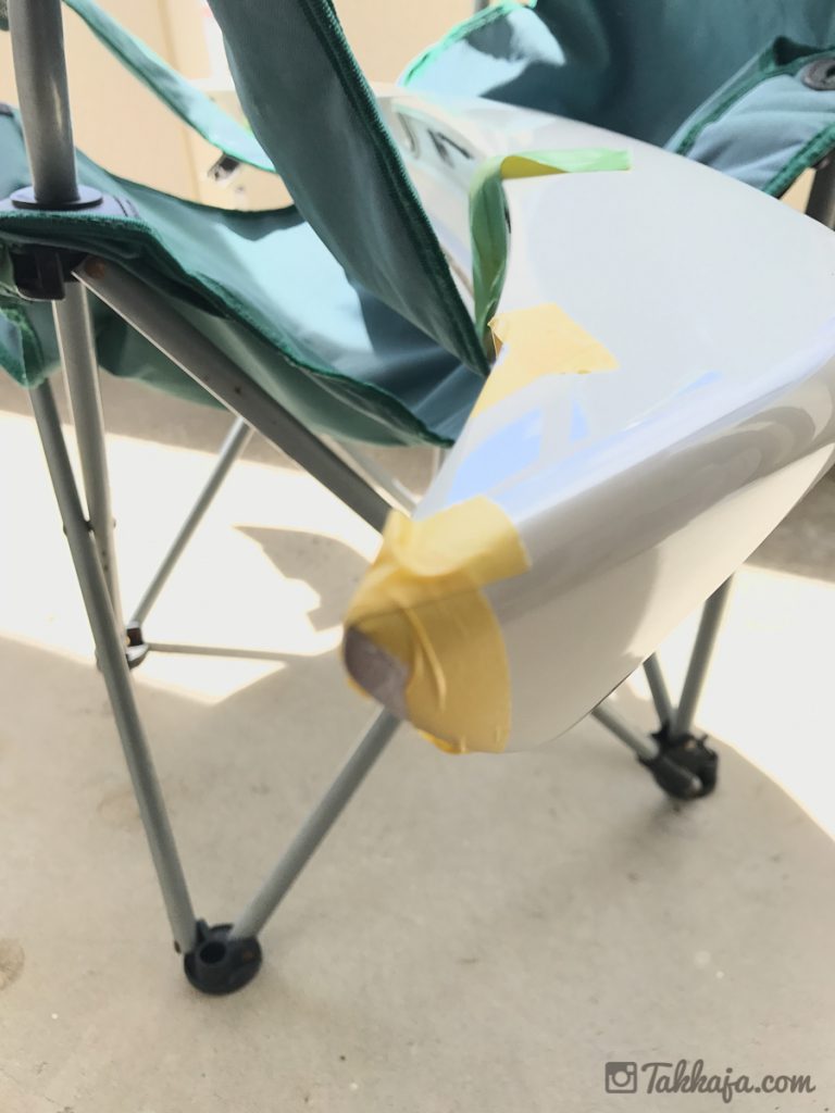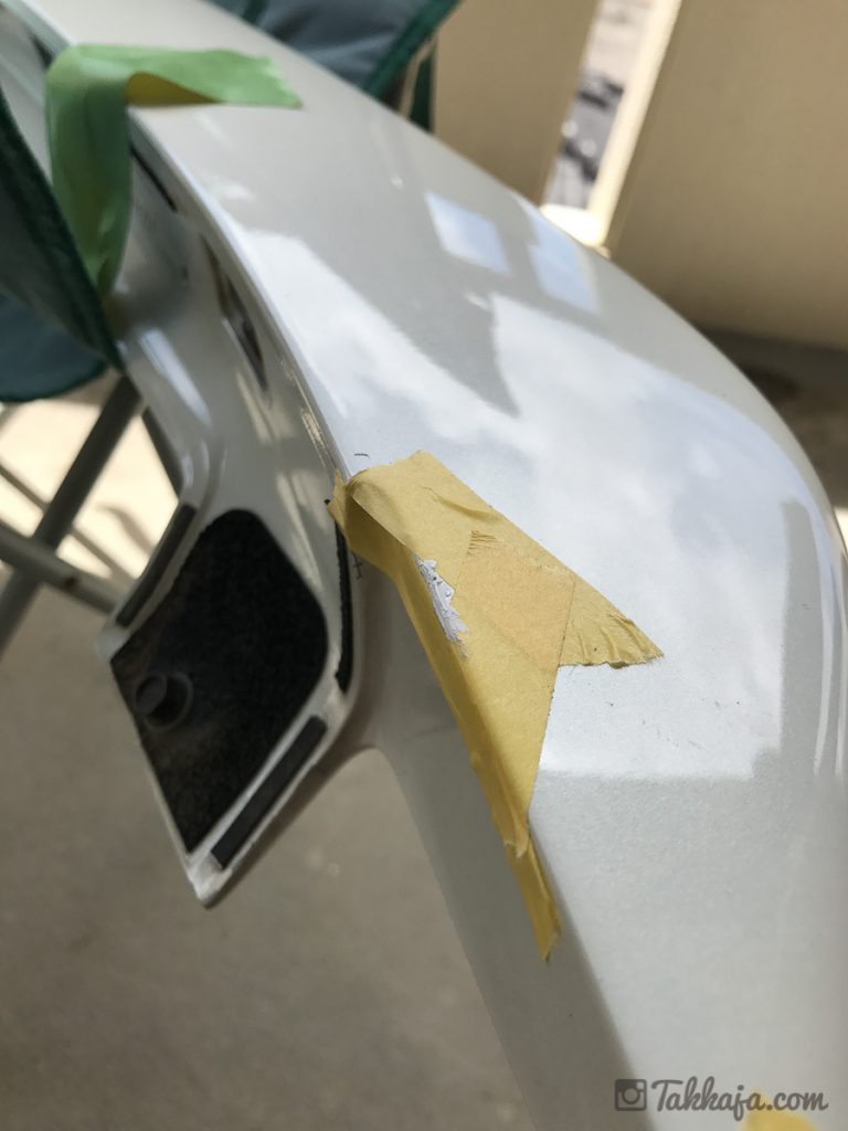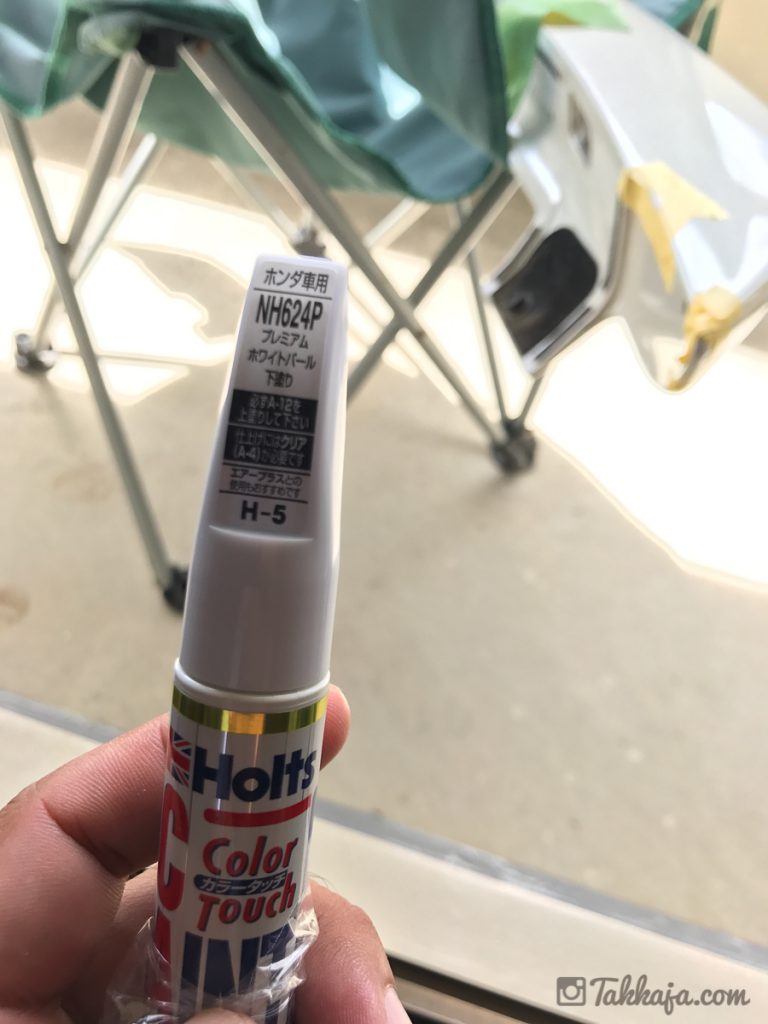 パールホワイトなので、クリアの前に中間のパールが必要ですが、タッチアップできれいに仕上がる自身が無いので、「やらないよりはマシだろう」ぐらいの気持ちで気楽に補修します