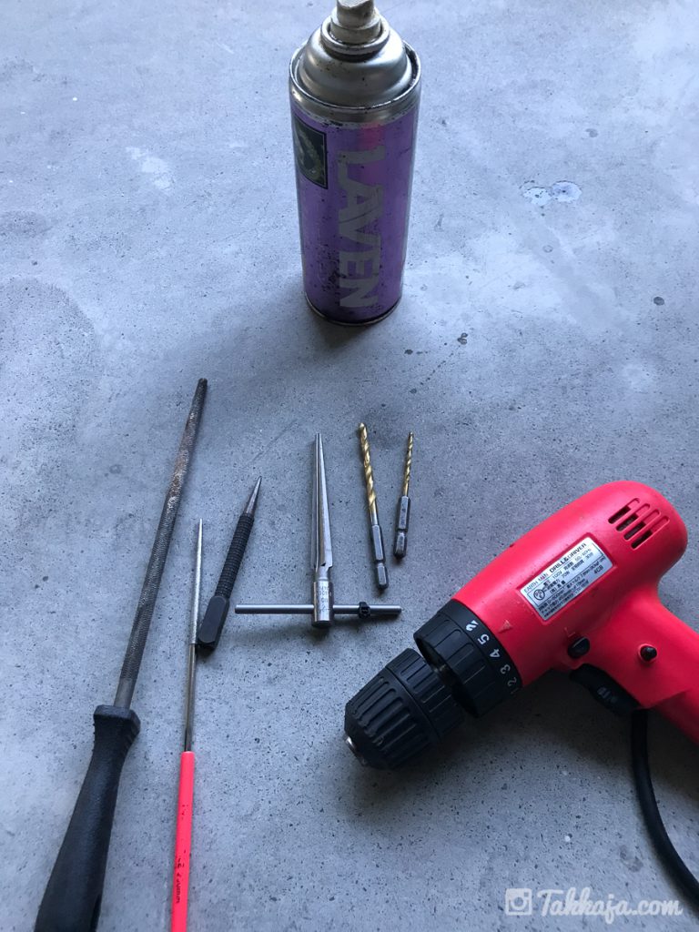 ポンチで凹みを作り、手持ちの鉄工キリで3mm→5mmと穴あけ切削油の代用で、その辺にあったチェーンルブを使いましたw