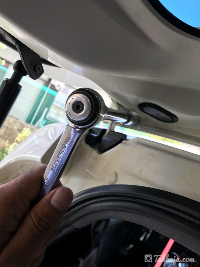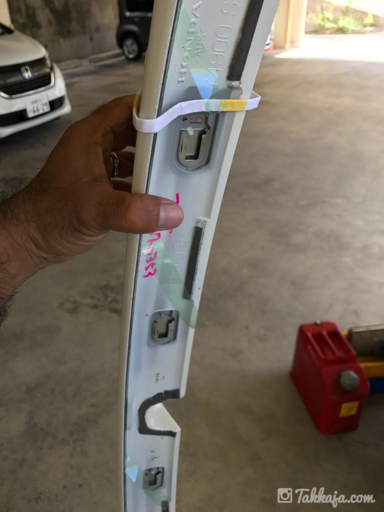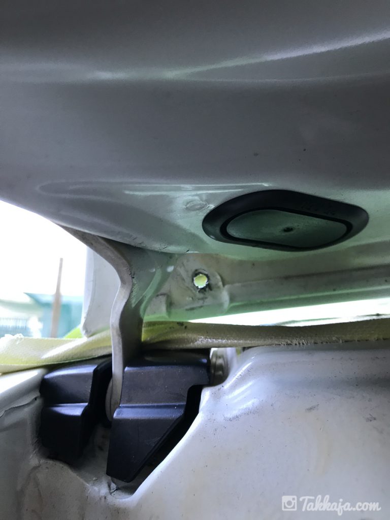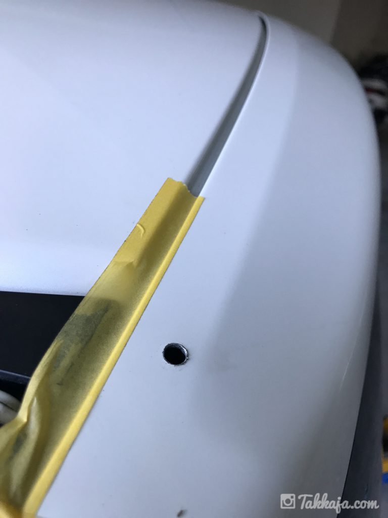 リアゲートを跳ね上げたところに、左右一箇所づつ穴を開けます。