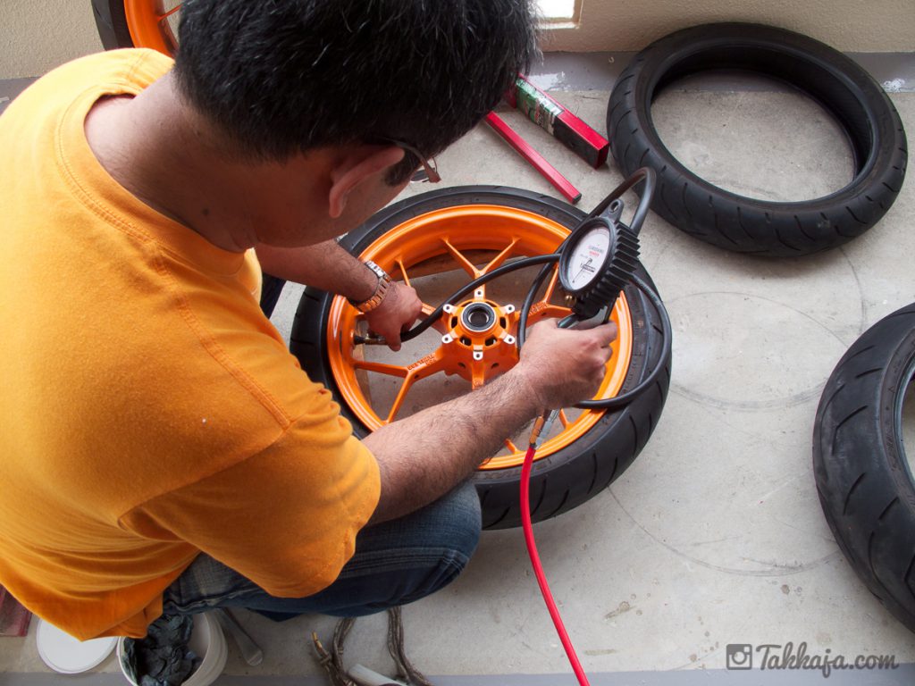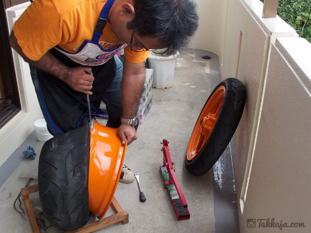高圧で一気に空気を入れてやれば、楽勝でビードが上がるとの事。