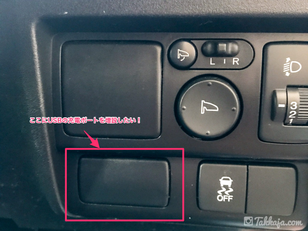 特に支障は無かったのですが、iPhoneスタンド導入と同時に、運転席右側にUSBポートを増設することに。