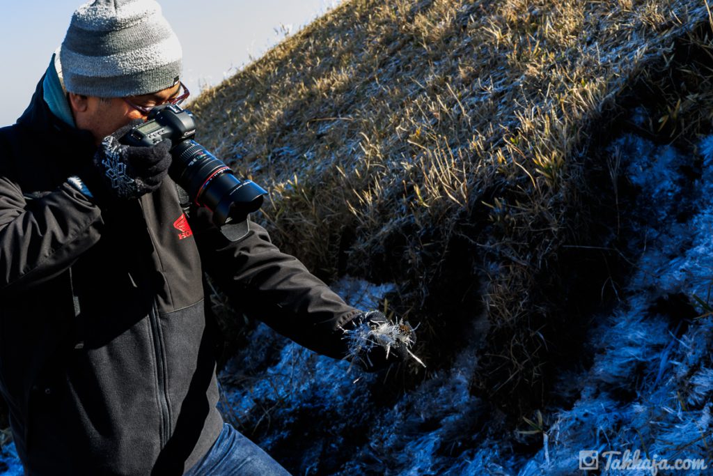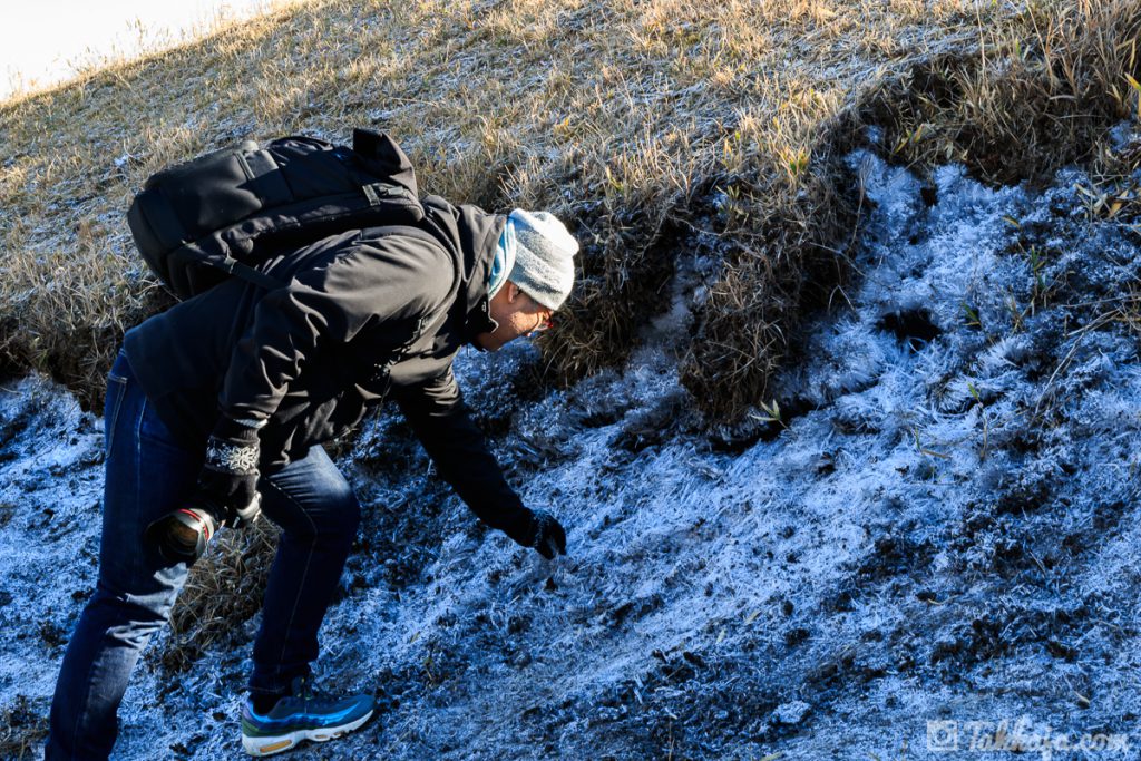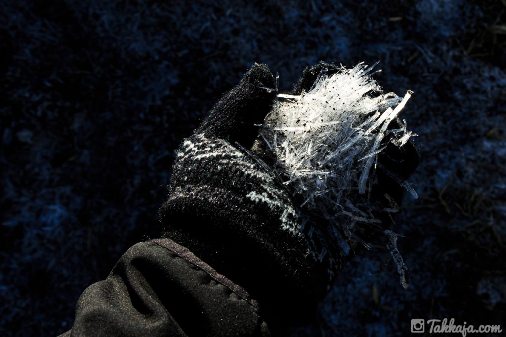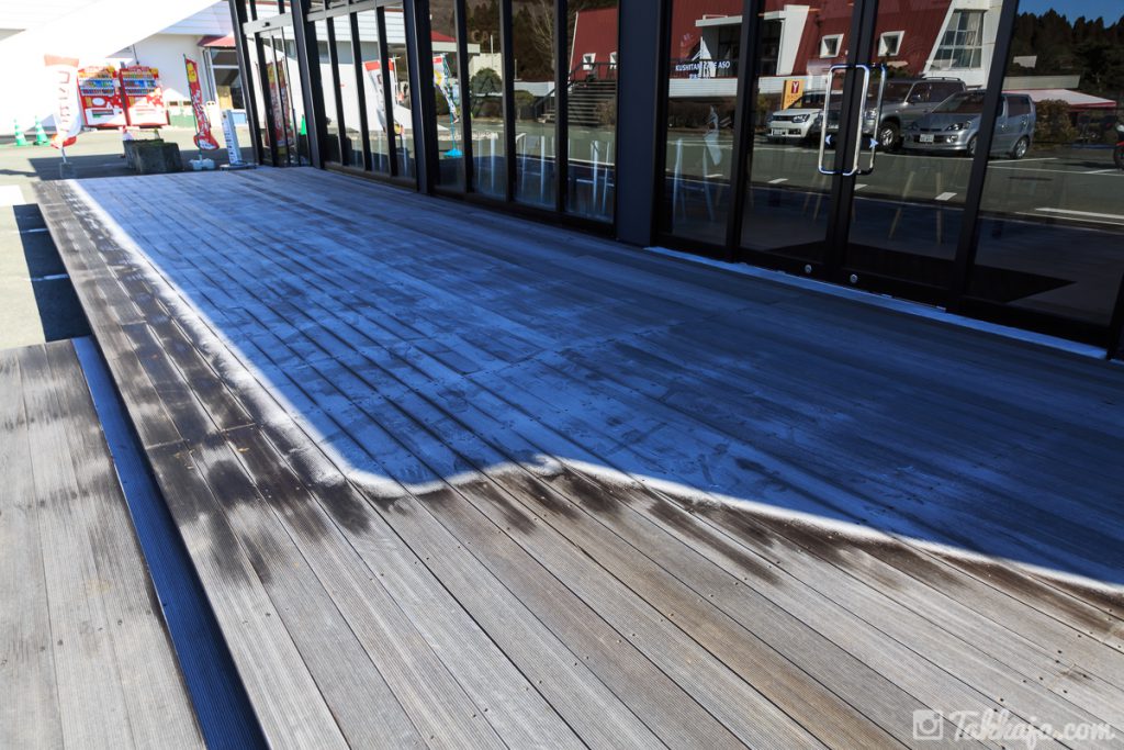 お昼前でも日陰部分ではまだ氷が残るデッキ。