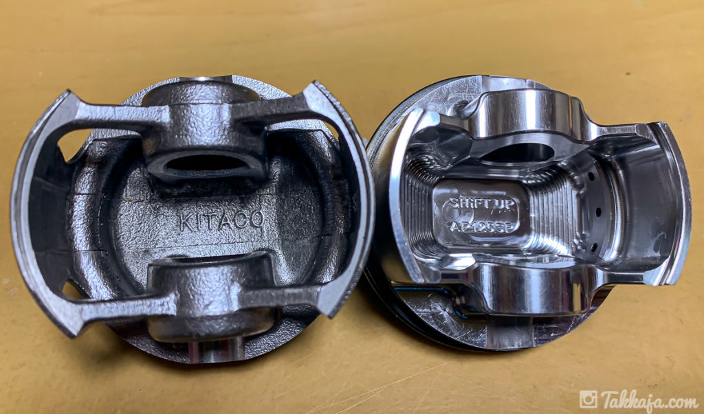 右のシフトアップ製は切削の跡がきれいに出てて、鍛造ピストンであるのが分かります。