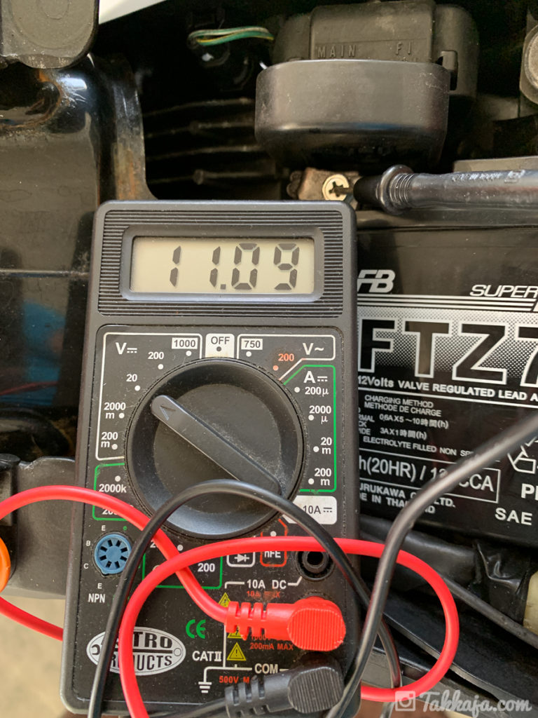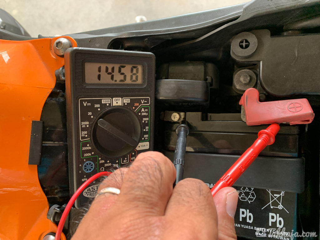 新品取り付けて、エンジン始動し電圧を測定するとこんな感じ。