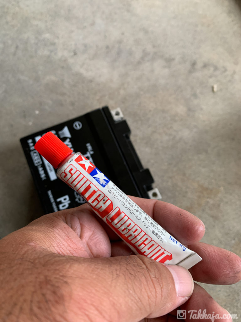 セオリー通り、マイナス→プラスの順に取り外し、接点にはグリスを塗って取り付けます。