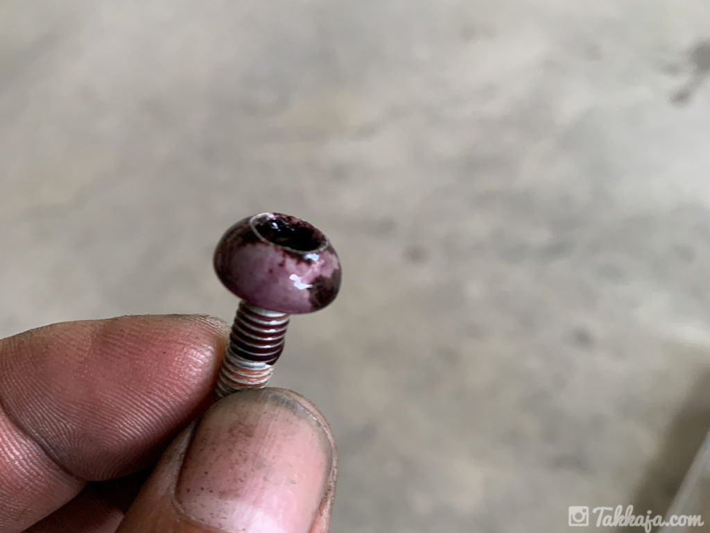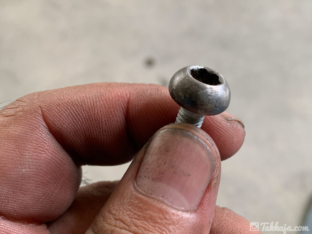 フロントブレーキディスクを固定しているキャップボルトですが、写真のような状態。