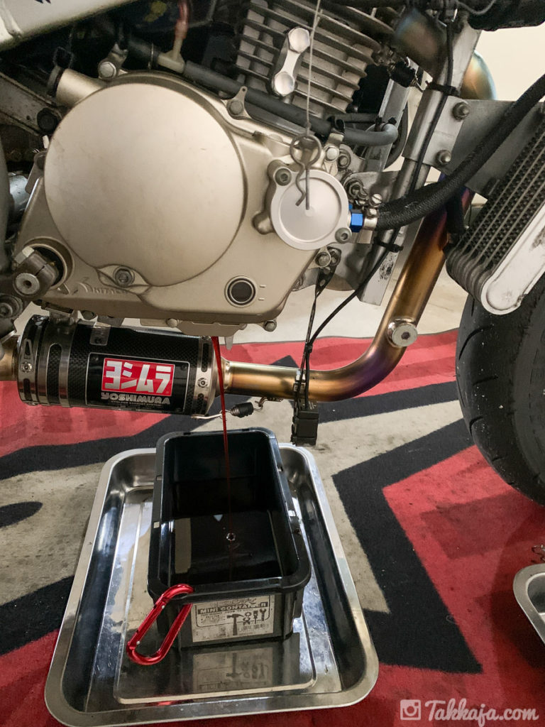 ワイヤリングを切って、ドレンボルトを外してオイルを抜き取る。