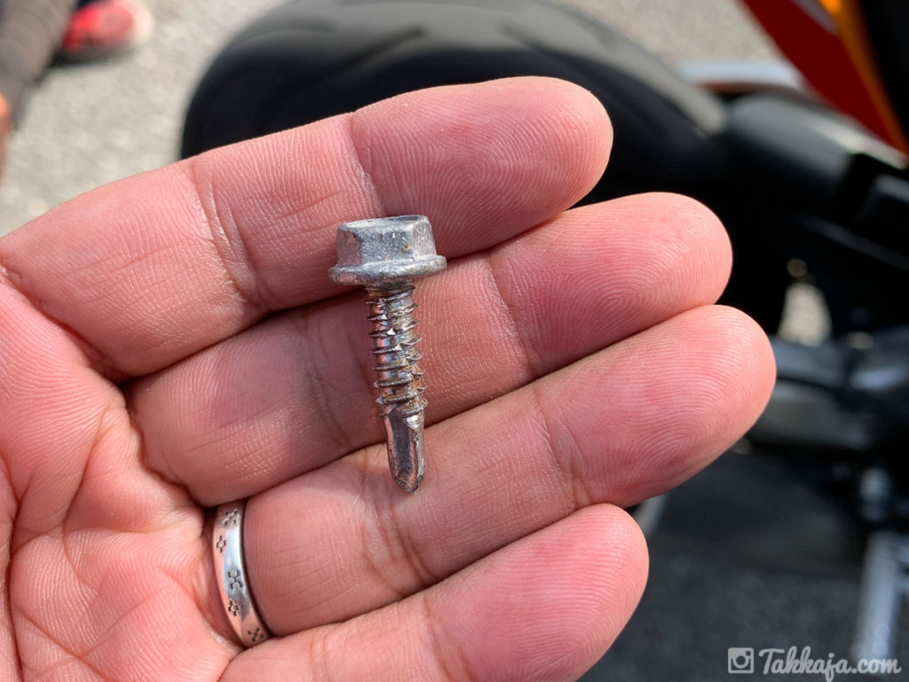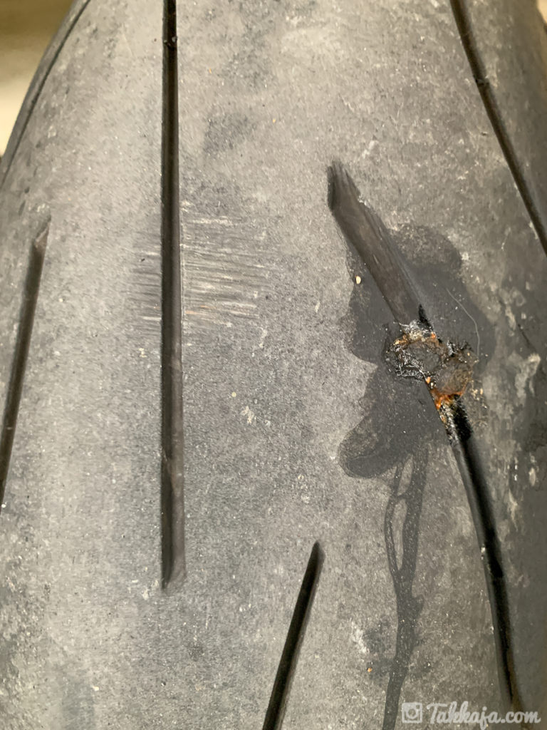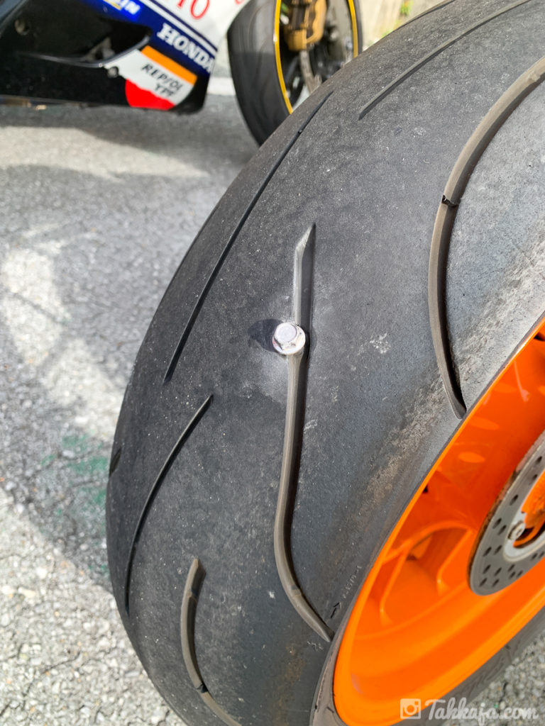 ビスが中央よりやや右に刺さってるので、右コーナーはスピード落とし、体を思い切りインに入れて直立コーナリング。