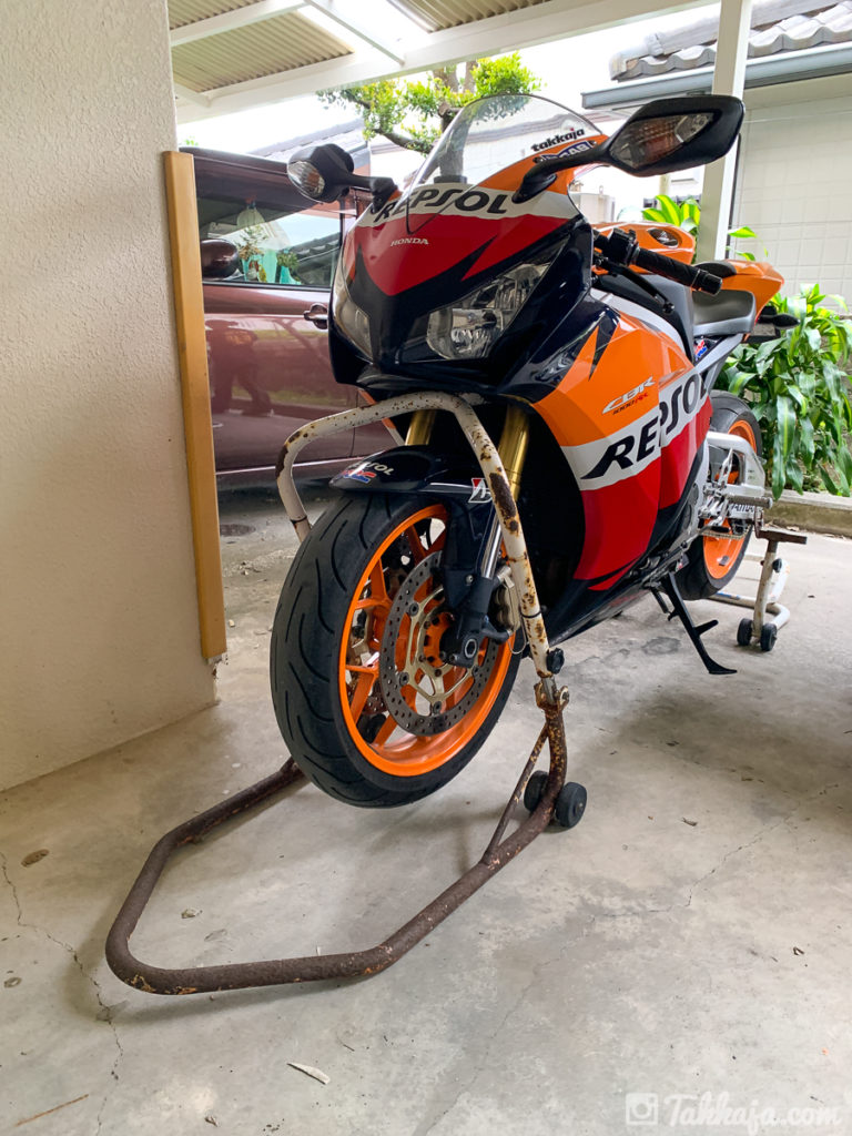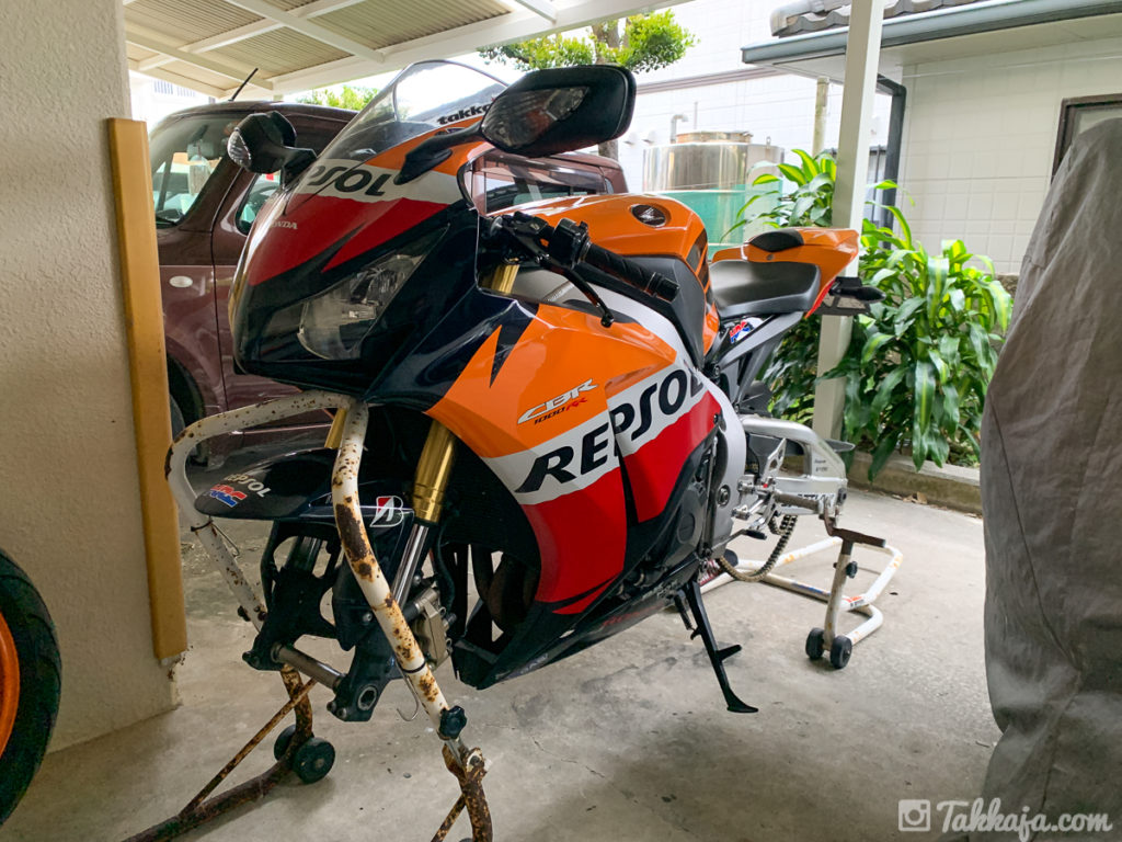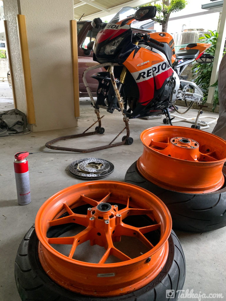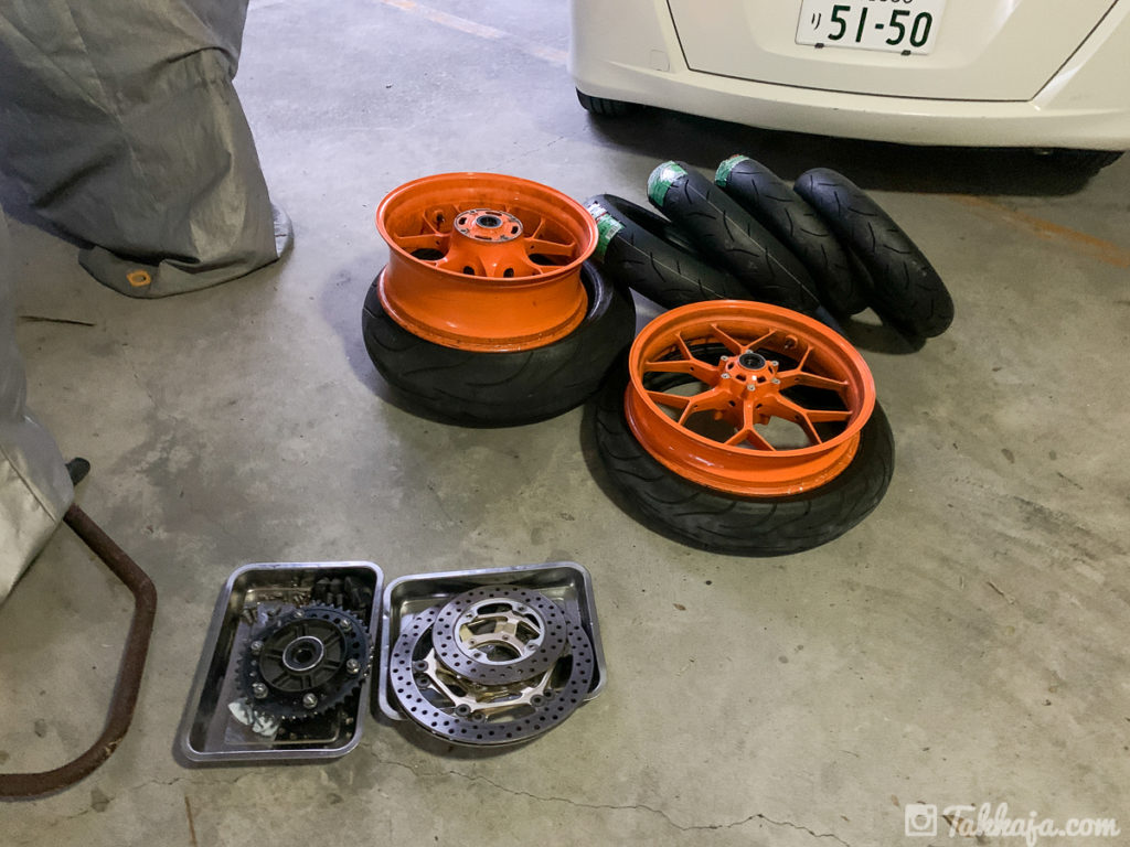 疲れた体で、今日ツーリングで使用した装備やら、NSF用の新品タイヤ2セット分、CBRのタイヤ・ホイール外したブレーキディスクなどの片付けで一体何回4階まで階段往復しただろう・・・