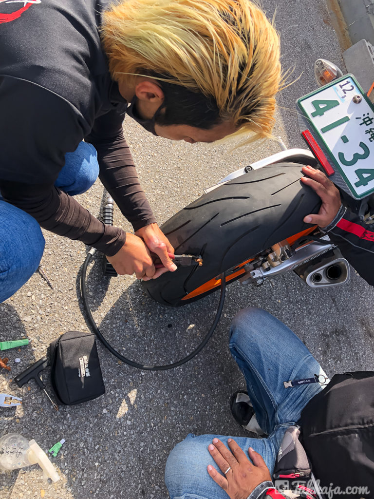 たまたまパンク修理キットがあるということで無理にお願いし、とりあえず空気パンパンに入れて読谷まで向かう。