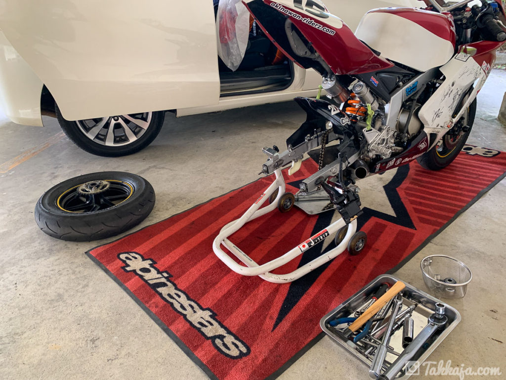 本当はキャリパー外して作業やりたかったんだけど、ブレーキホース止めてるボルトがどうしても外れない。