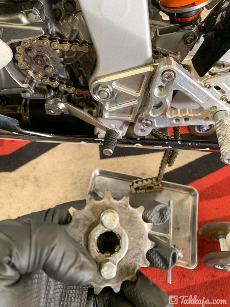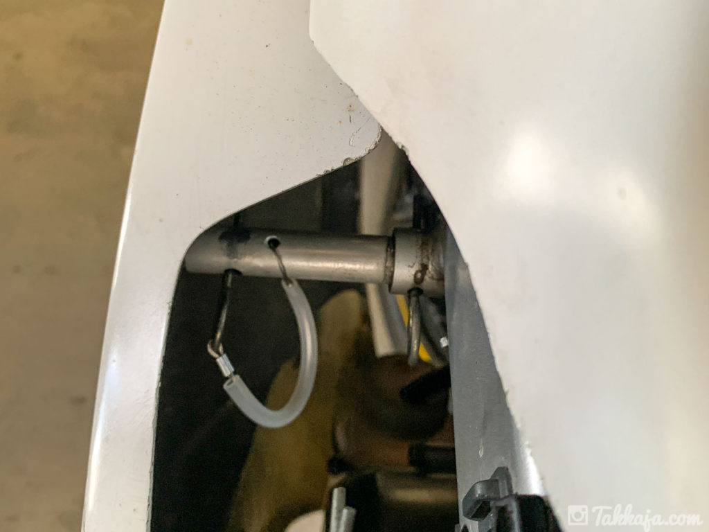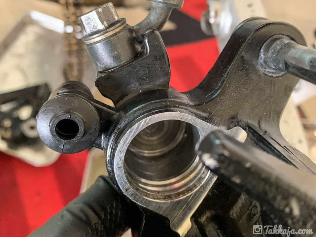 車体に取り付けた状態だと、コンビレンチしか掛けられなくて、ハンマーでコツコツしても緩まないし、長い工具かけるには車体から外さないといけない。