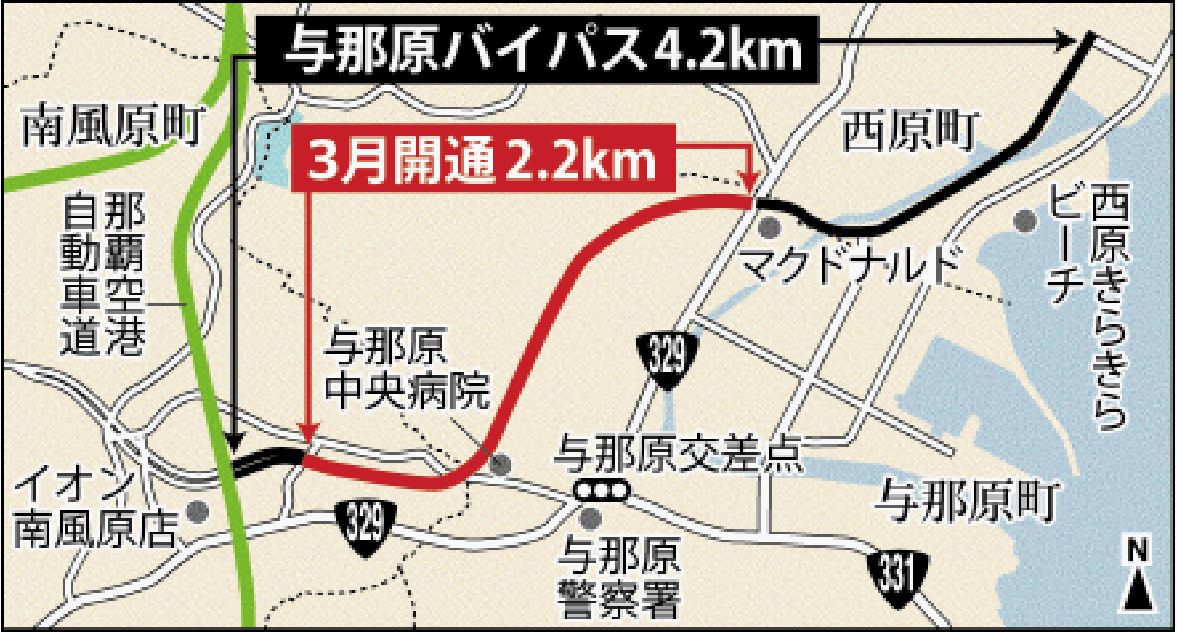 3月に全線2車線で暫定開通した国道329号与那原バイパスについて、沖縄総合事務局は30日までに、開通約1カ月後の交通状況を発表した。バイパスが開通したことで並行する国道329号の交通量が減少し、与那原交差点の渋滞が緩和された。また、東海岸地...