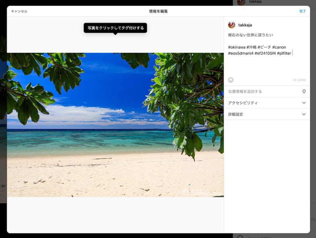 ただ、これにもまだ変な機能制限がかけられてる部分があり、投稿はできるが一度投稿した写真のキャプションの編集ができないという問題が!
