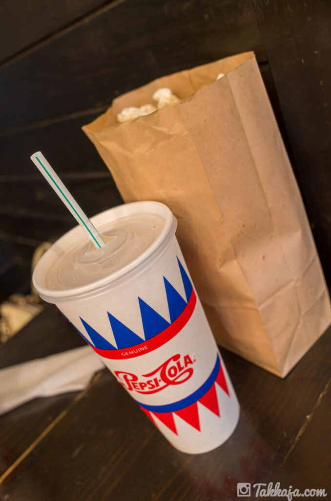 飲み物とポップコーンの包も、クラシックな感じで落ち着きますね。