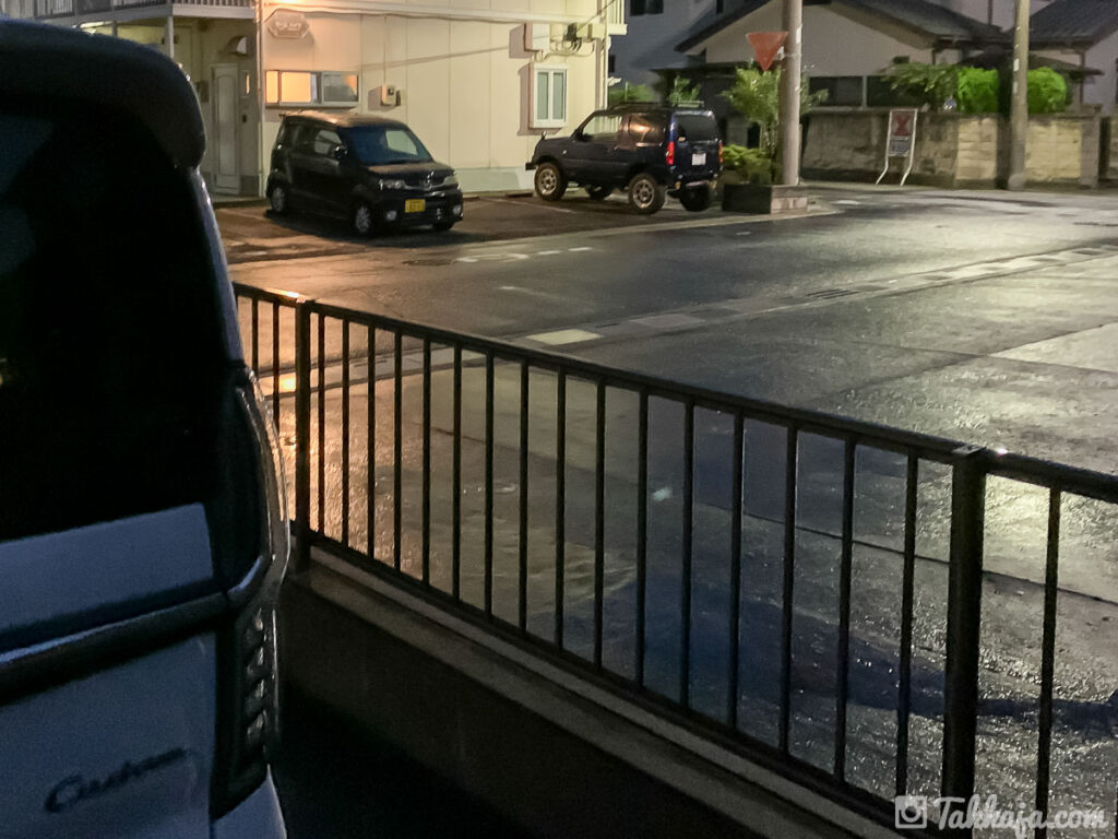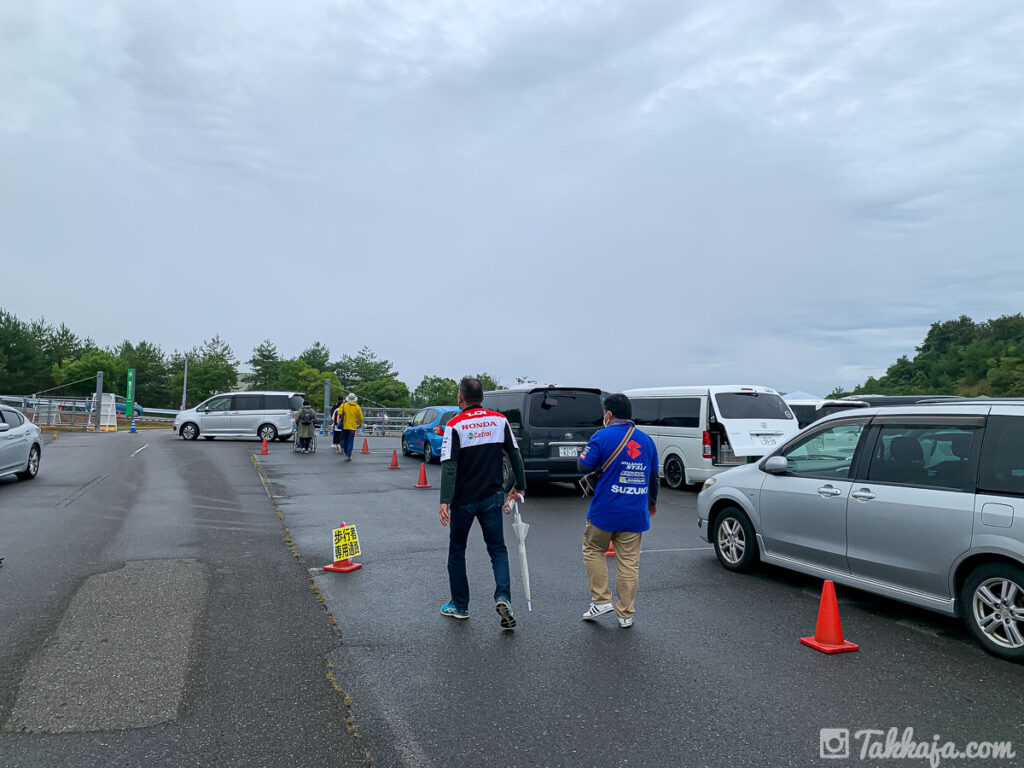 駐車場からゲートに向かう時も路面はウエットですが、降雨なし。