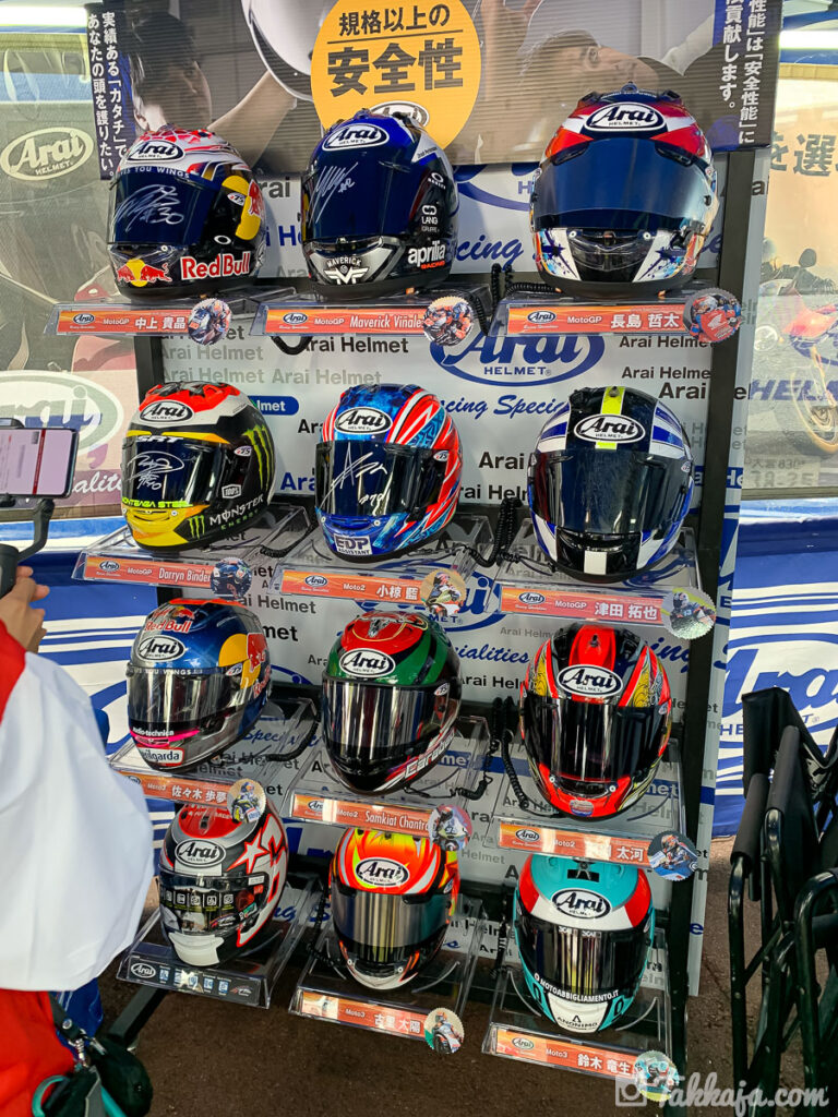アライヘルメットのブースに行ったら、契約ライダーのヘルメットがズラリ。