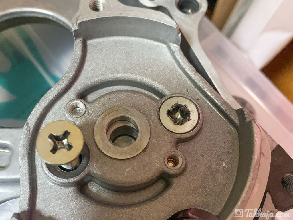 エンジンを隅々までばらばらにするときに、ラスボスとして立ちはだかっている、オイルポンプを固定しているプラス頭の皿ネジ2個(おんなじパターンでステーターベースにも3個使われています)
