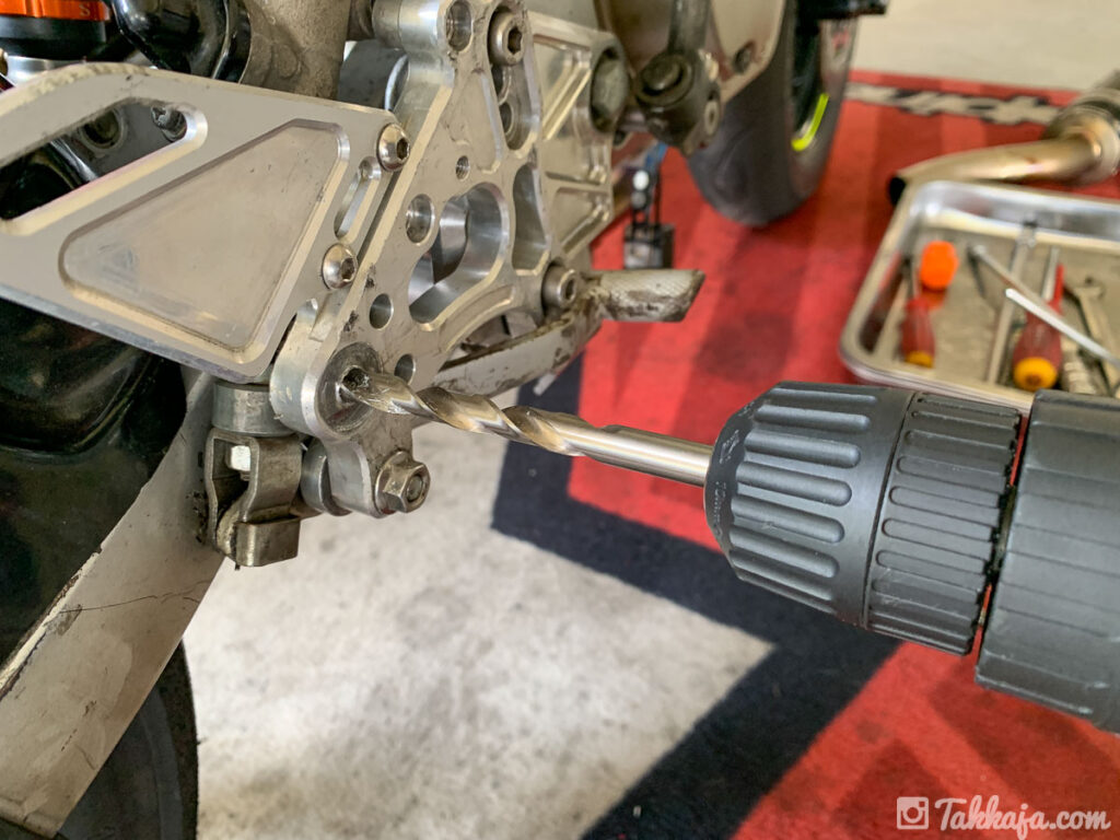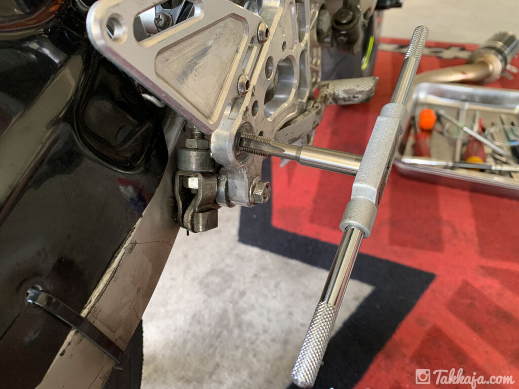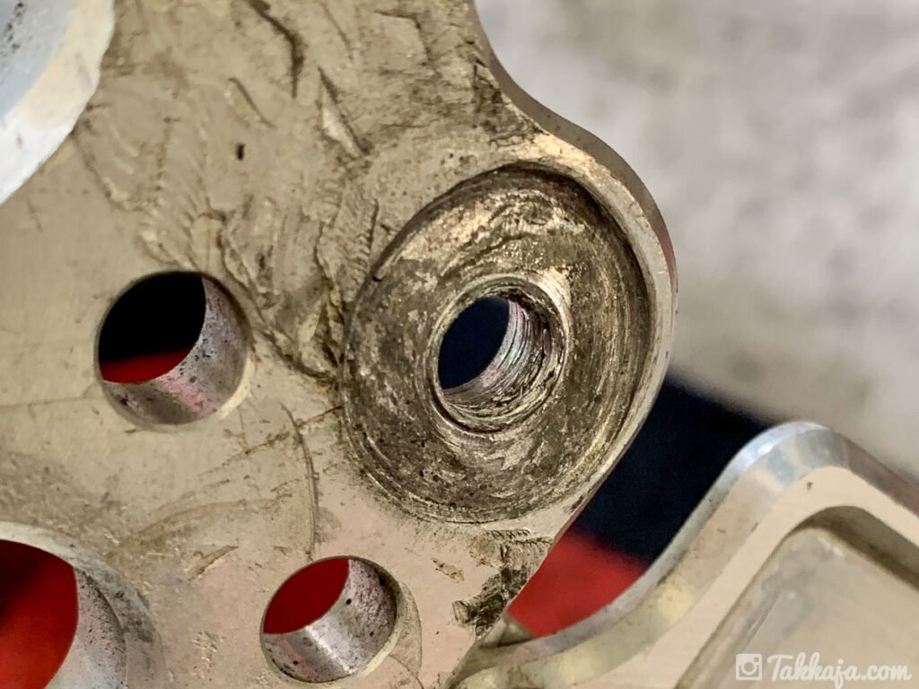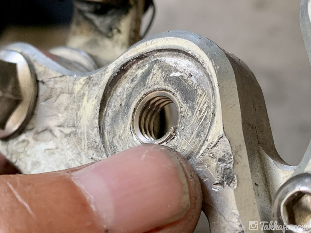 先日の転倒で痛めてしまった、ステップバーのネジ穴。