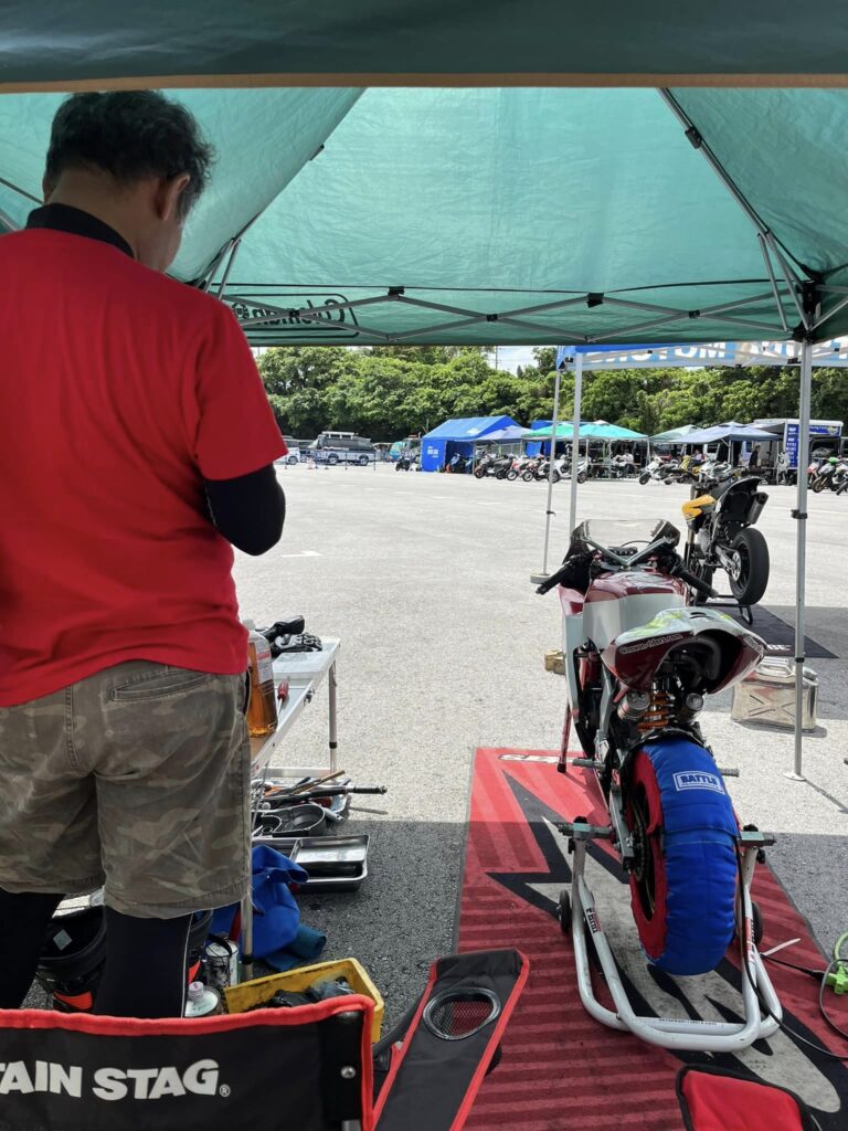 ツナギに合わせてヘルメット買ったみたいで嫌ですが