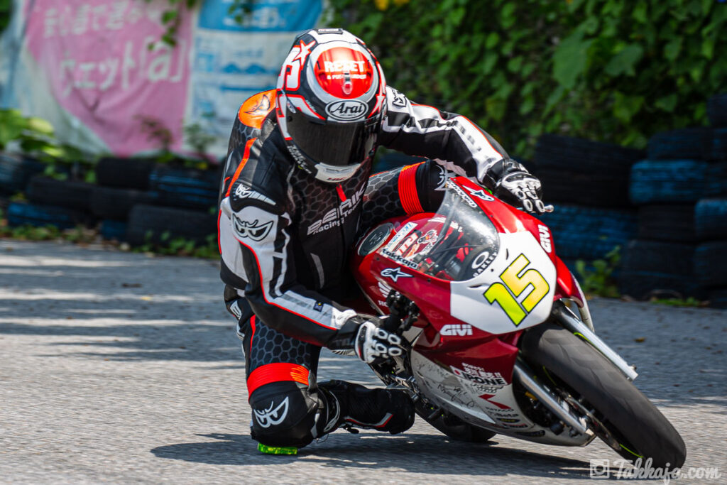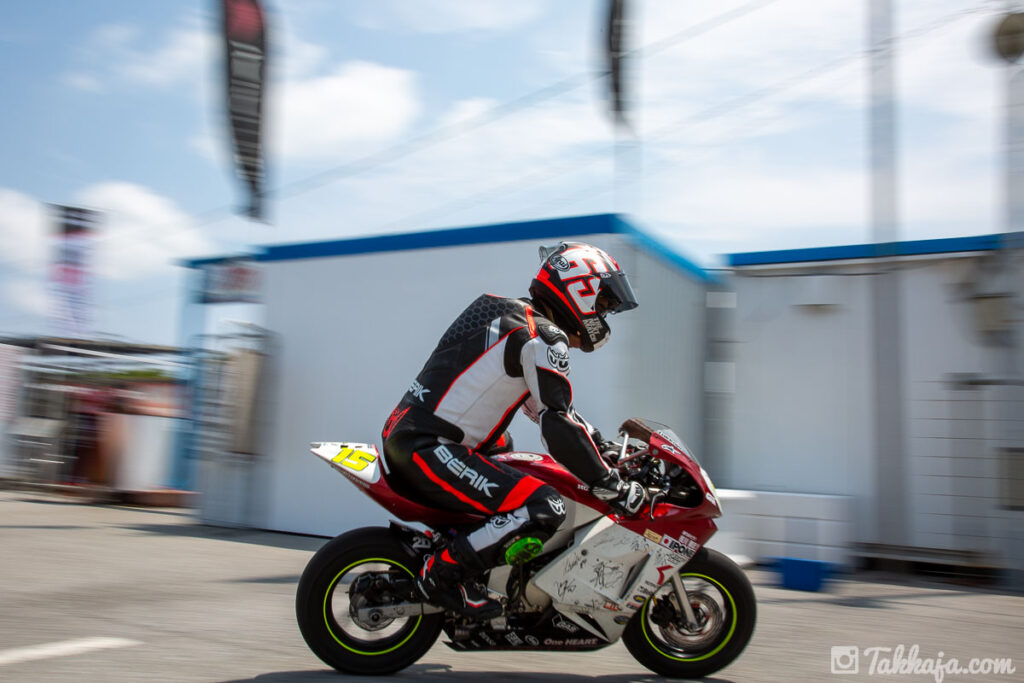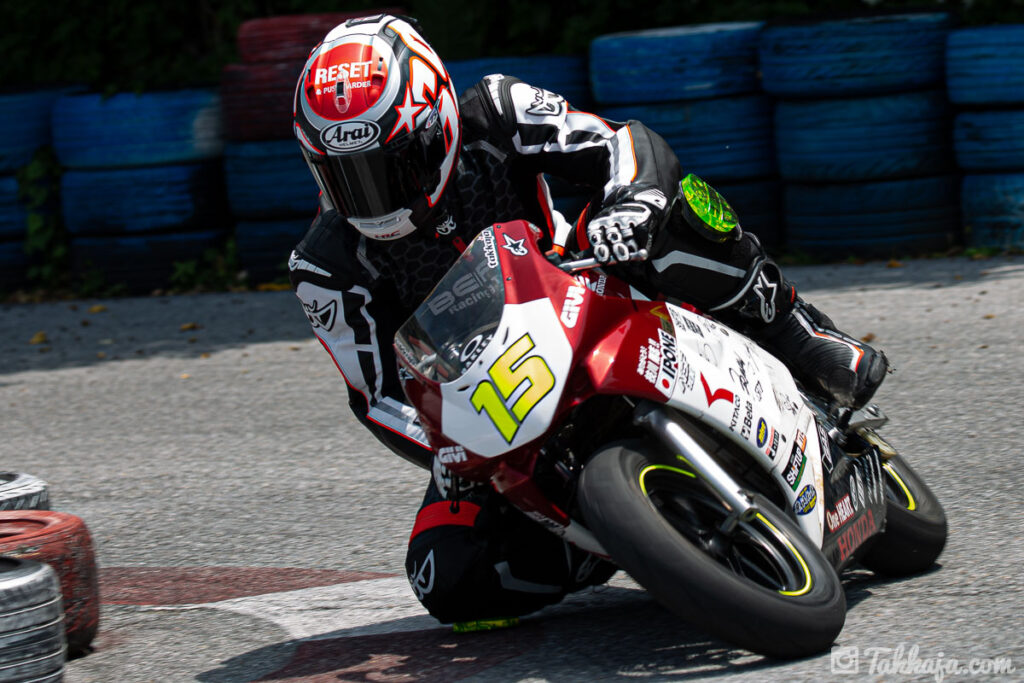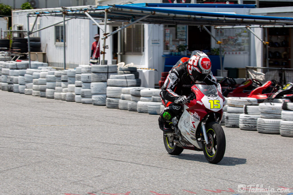 課題のライン取りと、1コーナー後のバンクしながらのブレーキングを意識して走行。