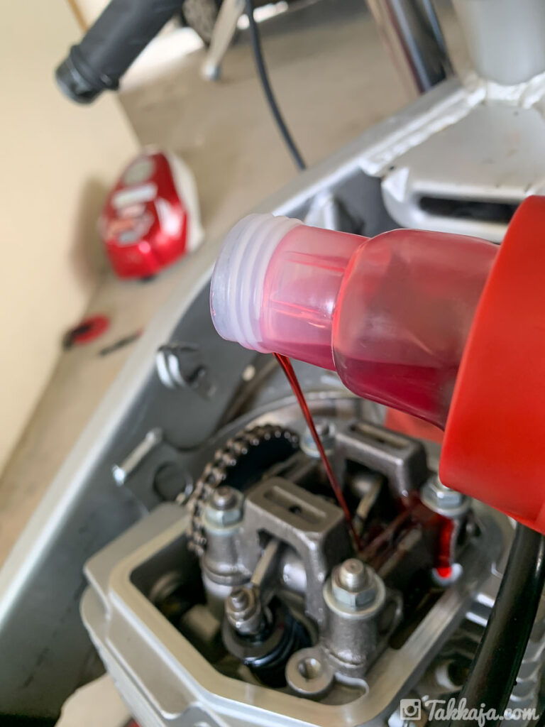 ヘッドカバーを開けて、カム周りにドバーッと。