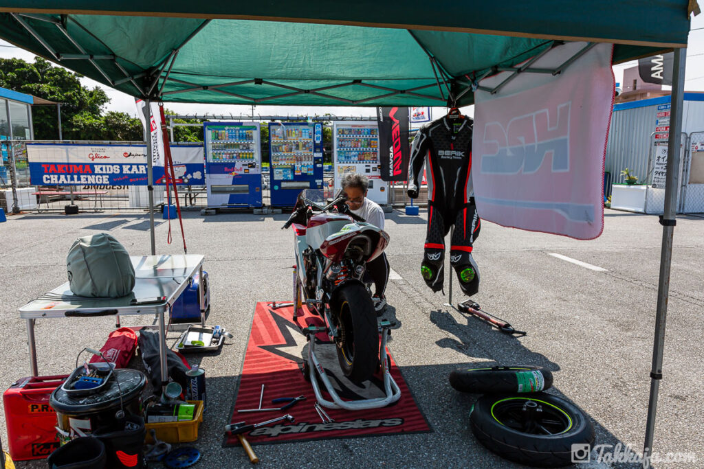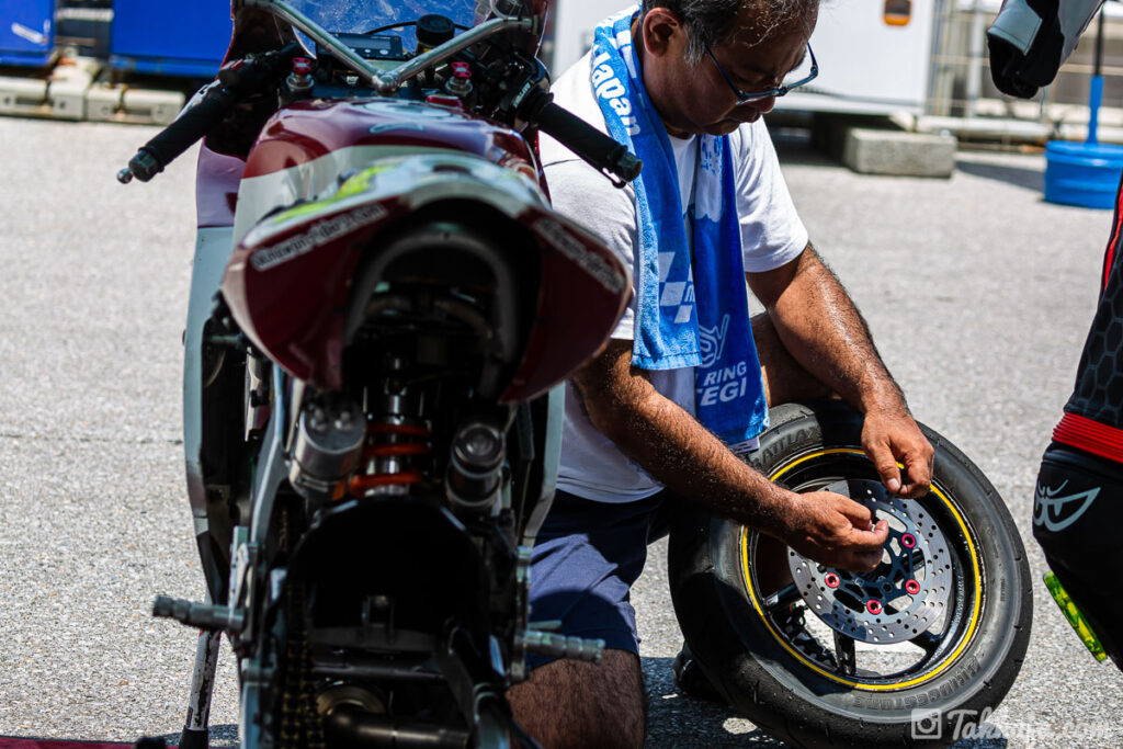 走行後は熱中症になりそうな中、タイヤを外してレインタイヤ作ってレース準備。