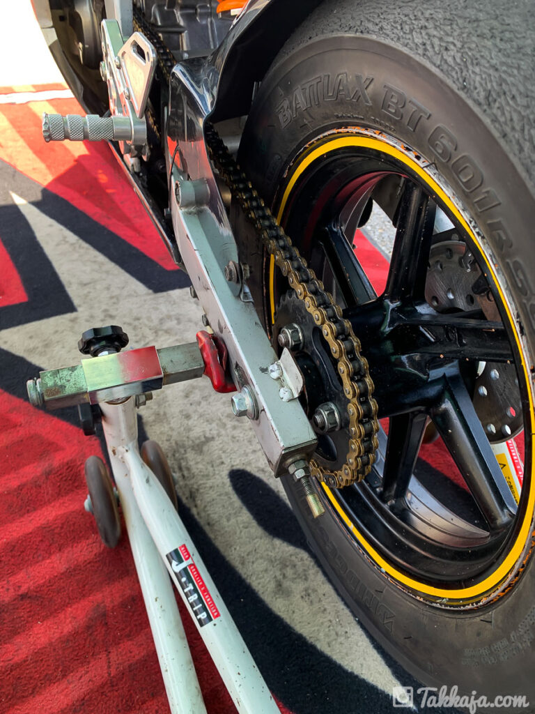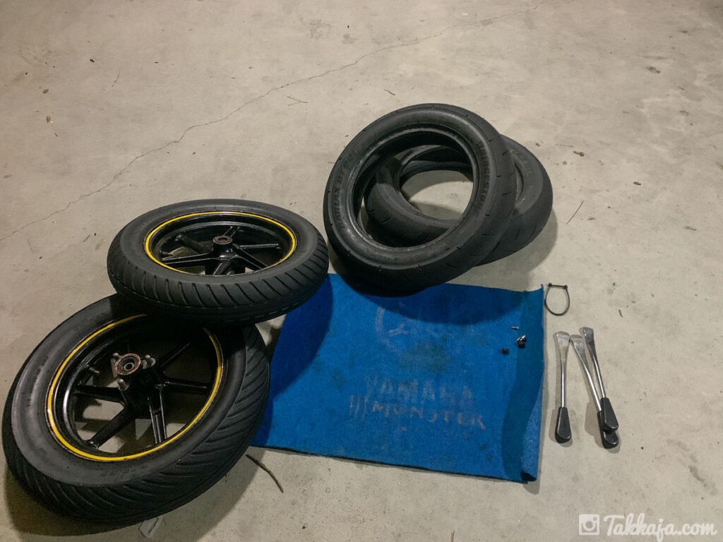 前日の夜に急いで、スペアホイールについているタイヤを、本番用レインタイヤから、中古タイヤへ履き替え。