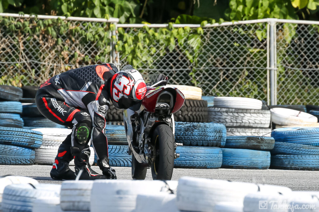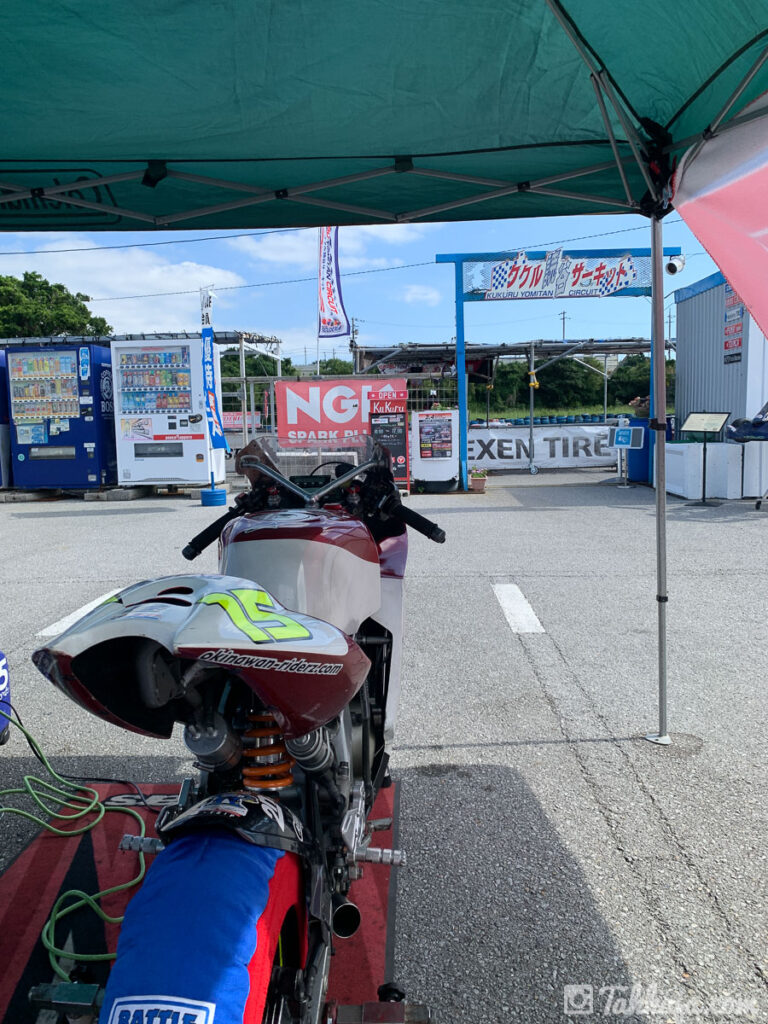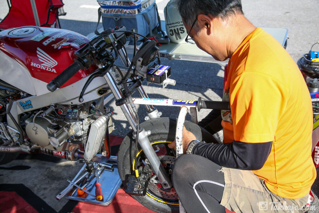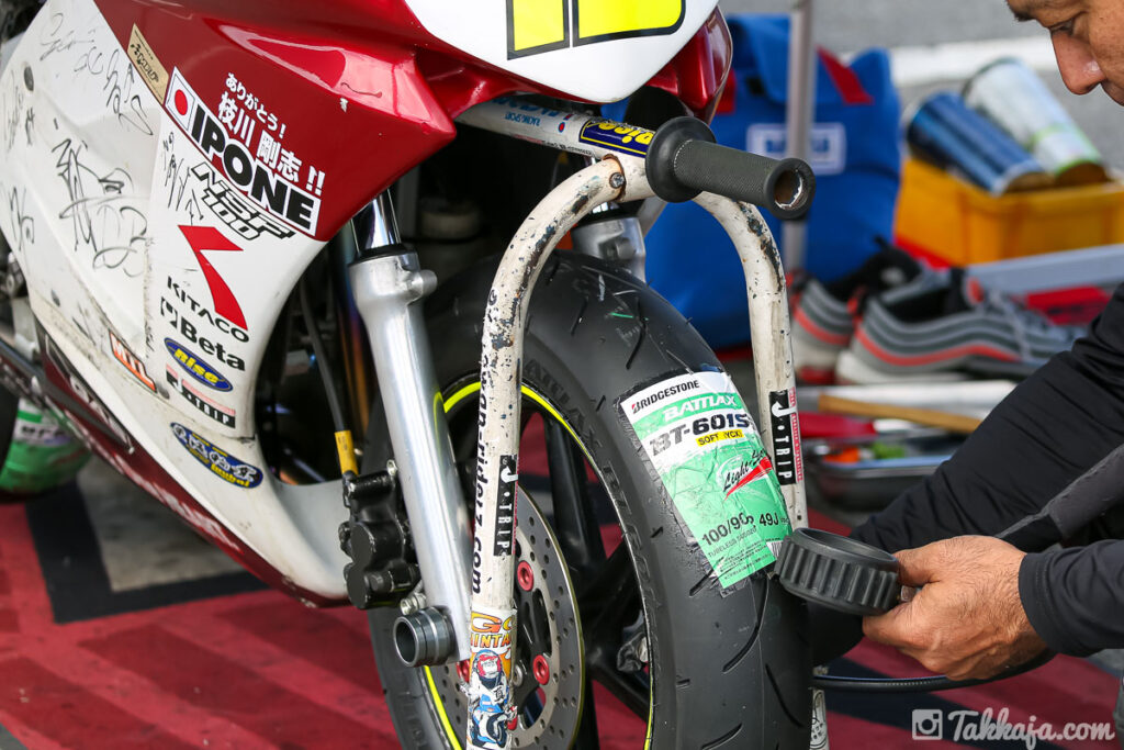 すぐに攻め始める事ができるように、ちゃんとタイヤウォーマーも巻きます。