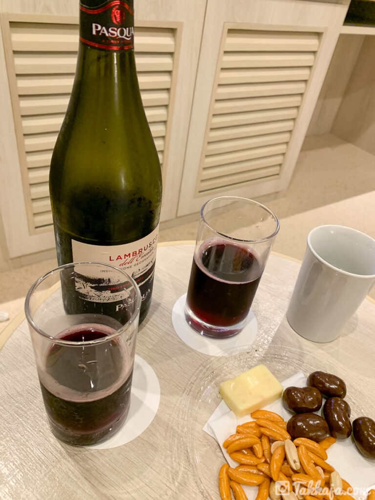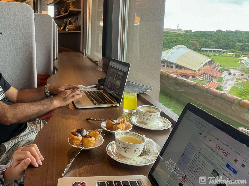 昼は無料のラウンジで、おやつ食べながらコーヒー飲んで