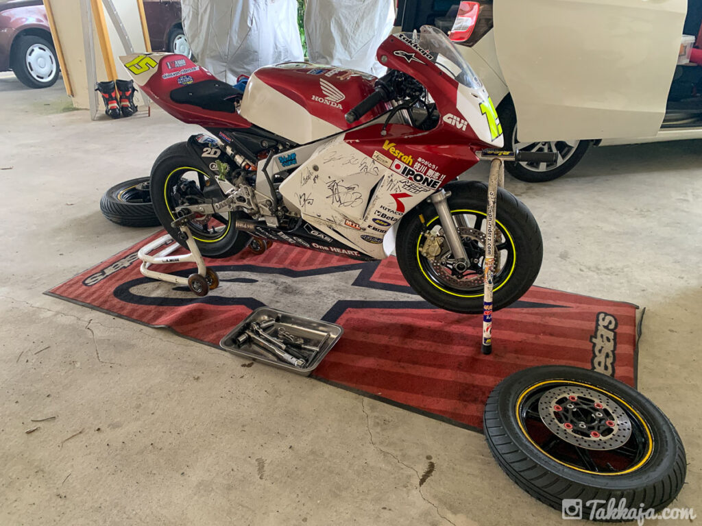 さっと交換してカウル類を下に戻して、最近整備終わりに必ず行っている前後タイヤ交換の練習。