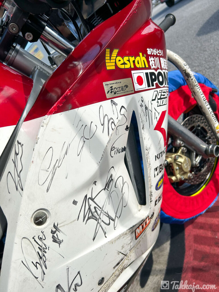 自分のバイクにサイン入れるのは全日本ライダー以上が条件となっていますので、来年全日本にステップアップしてもらわないと困ります。