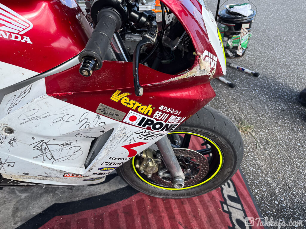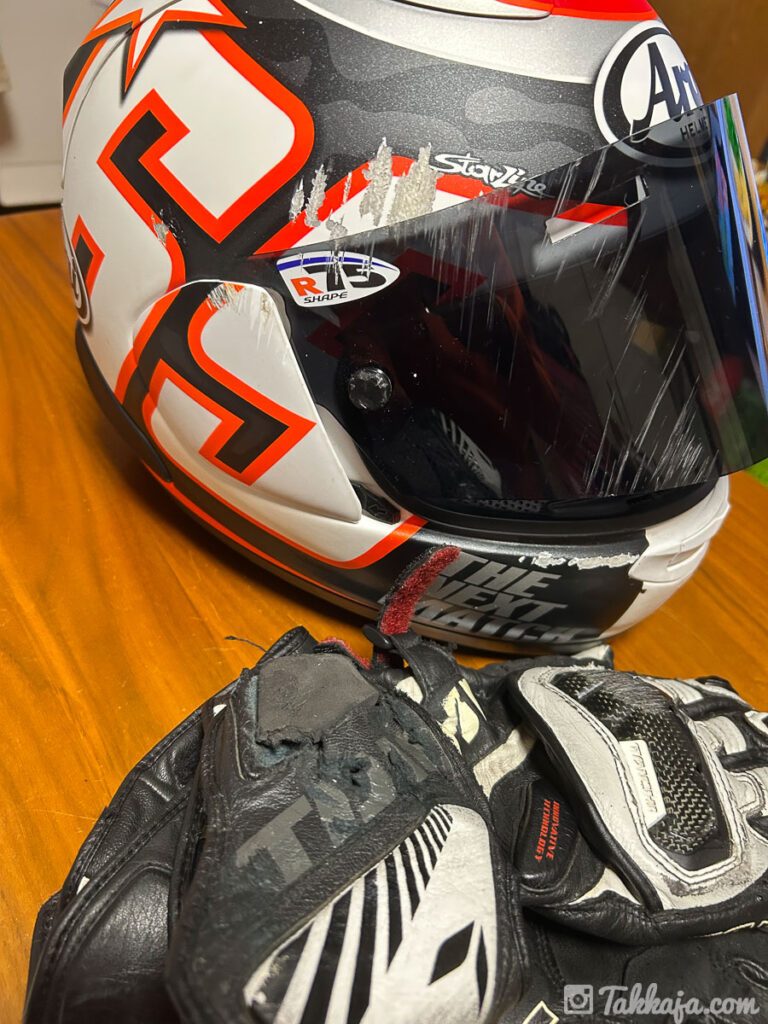 ヘルメットは傷、グローブも破れ