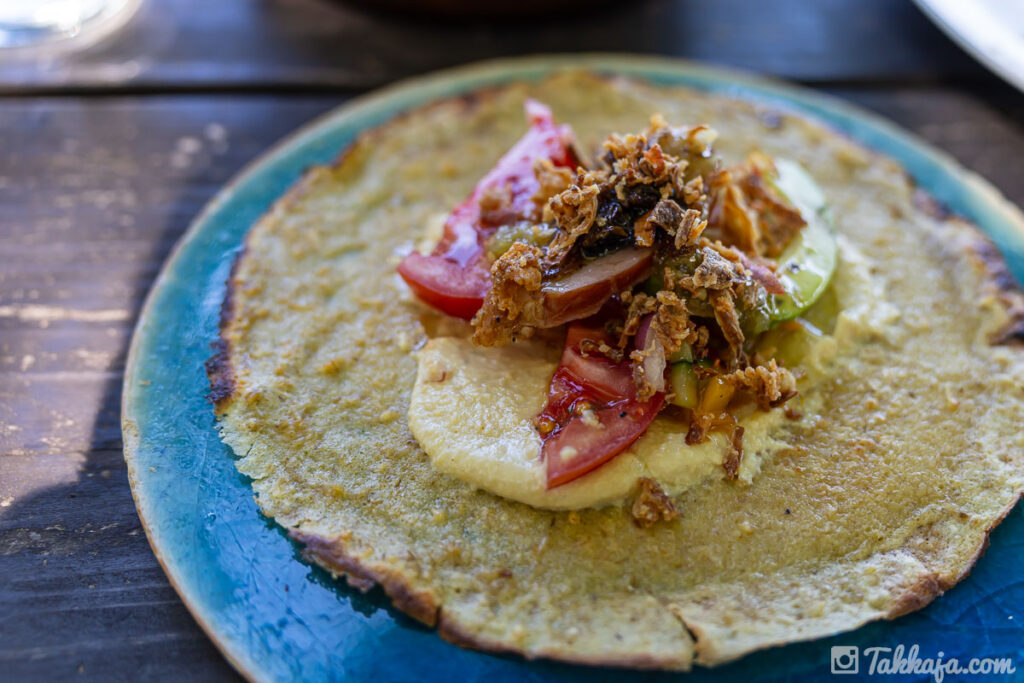 フムスを、皮?パン?に塗って
