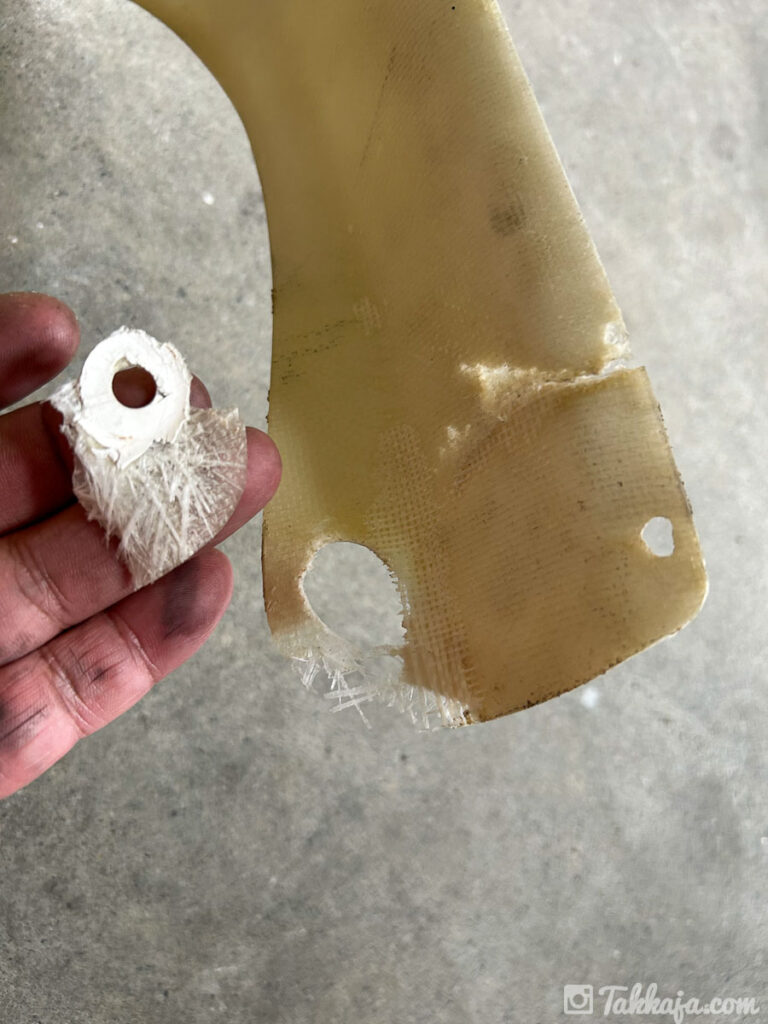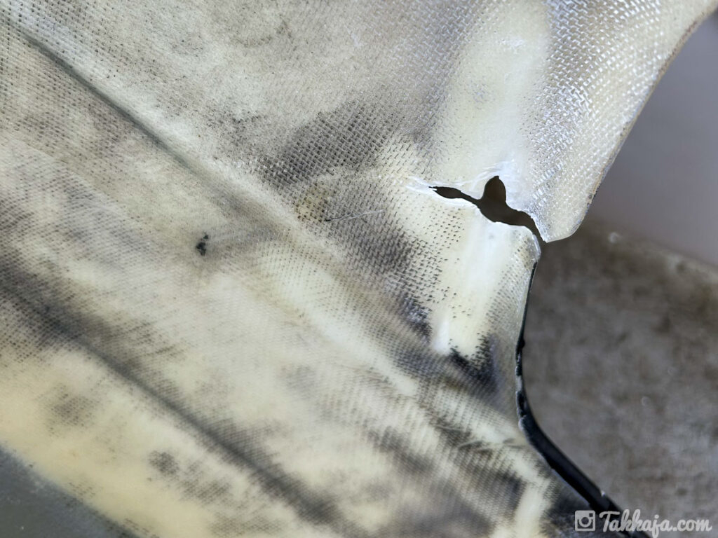 ガムテ補修部分を剥がすとなかなかのダメージ。