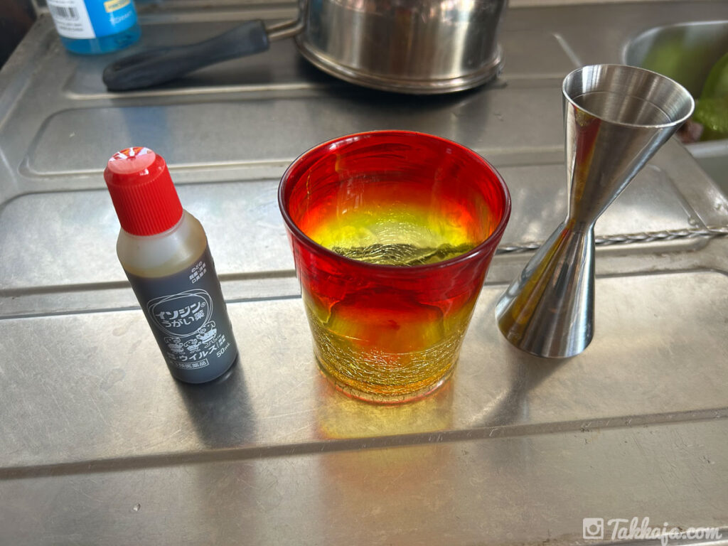 イソジンを薄めて作るうがい液は、濃すぎてもあまり良くないらしく適切な水の量を図るためにメジャーカップを投入。