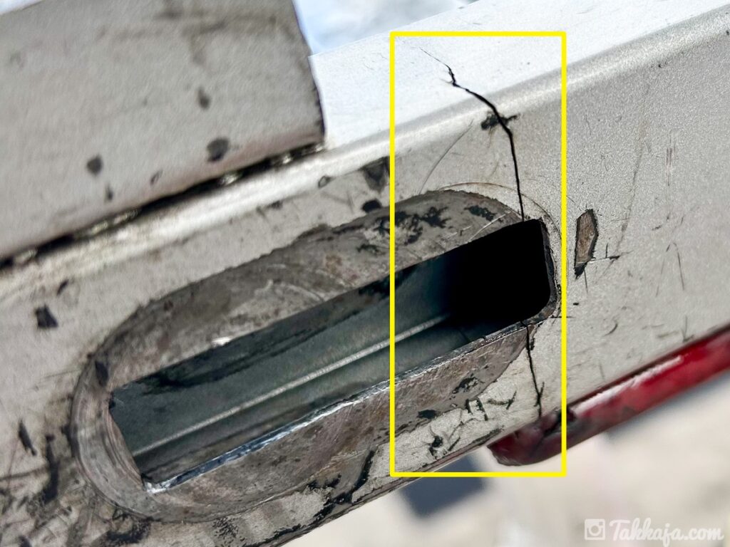 スイングアームの表面、4面のうち3面にクラックが伸びており、文字通り首の皮一枚で繋がってる(ちょっと大げさ)状態でした・・・
