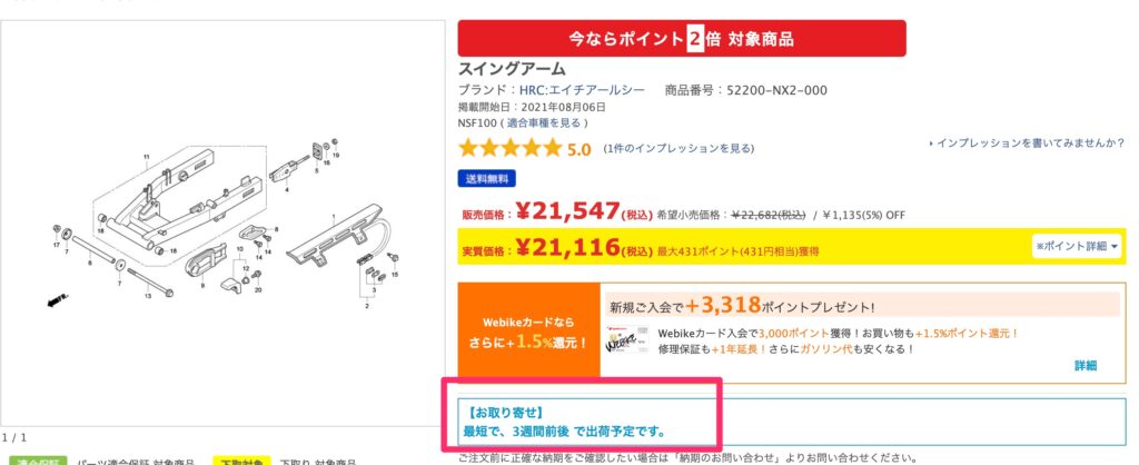 スイングアームの値段をネットで調べたら、思っていたより安い。